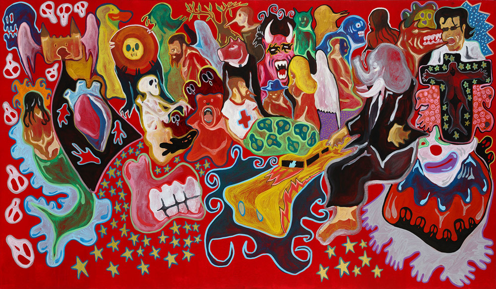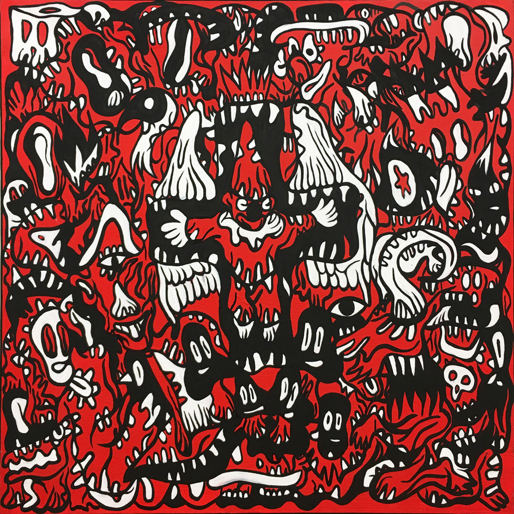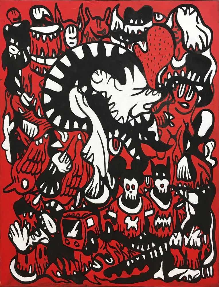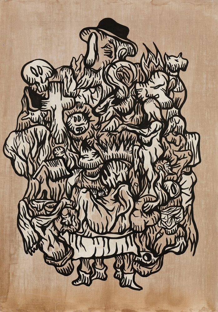 Encre, aérosol, crayon gras et pastel sur papier marouflé sur toile