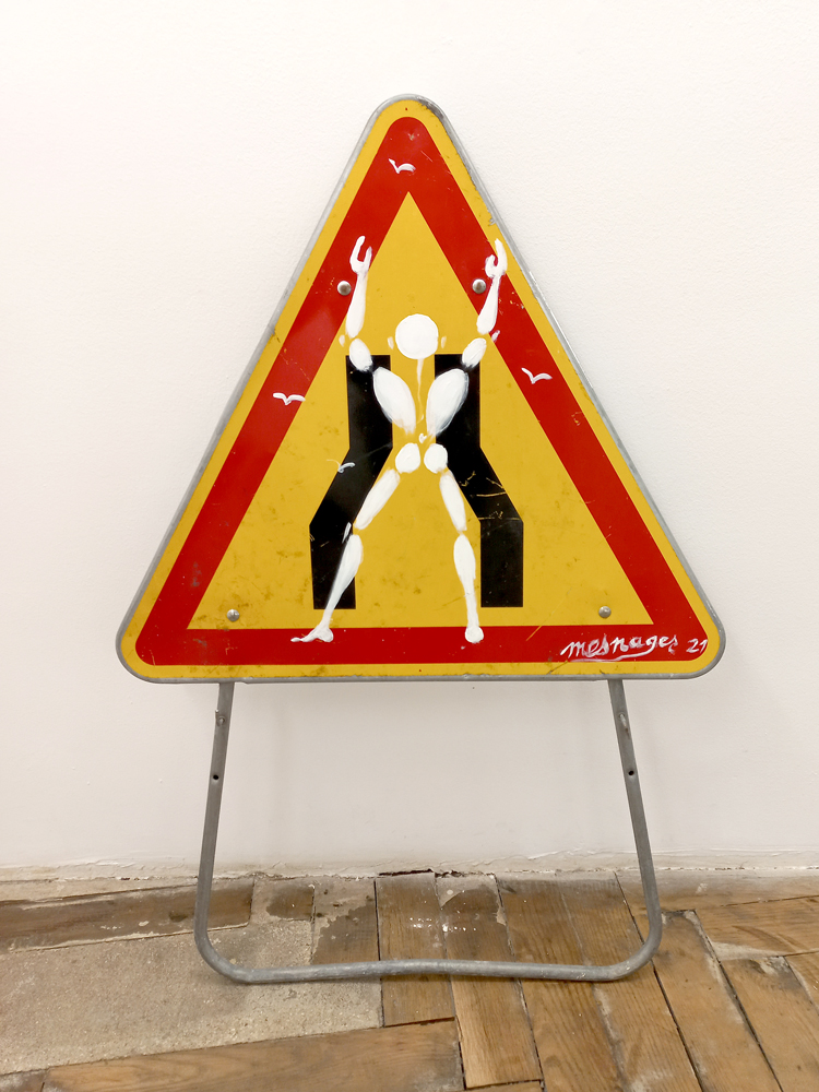 Acrylique et pochoir sur panneau de circulation